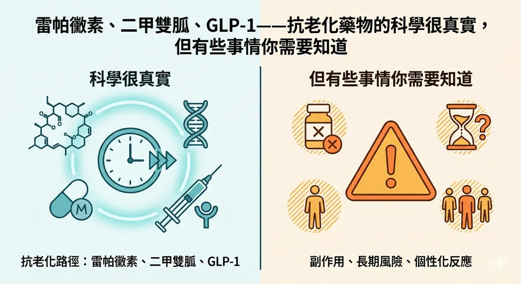 這不是保健品圈在炒話題。這三種藥物背後的分子機制,是目前抗老化研究裡最被認真對待的科學方向之一——有動物實驗、有人體臨床數據、有頂級期刊背書。