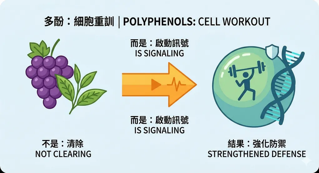 多酚不是在替細胞清戰場,它更像是在安排一場低劑量、可恢復、能讓防禦系統升級的訓練。