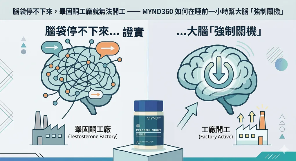 MYND360 Peaceful Night 舒眠膠囊處理的是 睡眠環境的修復——讓夜間的睪固酮製造窗口恢復,讓皮質醇節律重新校準,讓神經系統在睡前有足夠的靜默空間進入深眠。